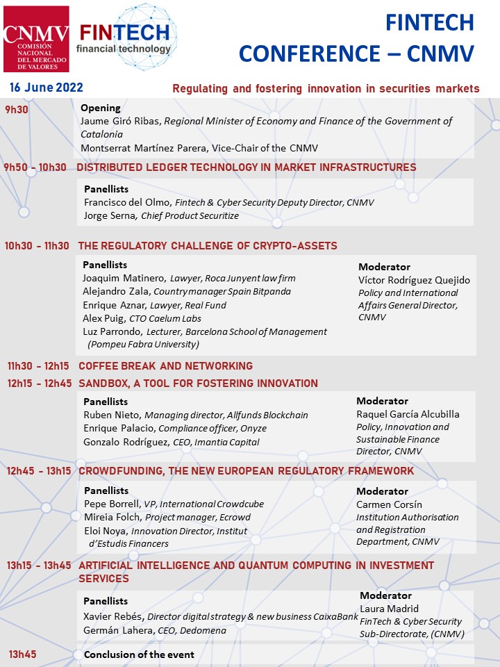 On Thursday, 16 June, the Fintech Conference – CNMV is to be held at its Barcelona office, to address the issue of regulating and encouraging innovation in securities markets. Issues such as distributed ledger technology in market infrastructures, the regulatory challenge of crypto-assets, sandboxes, crowdfunding, artificial intelligence, and quantum computing in investment services, among others, will be addressed at the event. Numerous sector experts, as well as the Regional Minister of Economy and Finance, Jaume Giró Ribas, of the Government of Catalonia and the Vice-Chair of the CNMV, Montserrat Martínez Parera, will be participating in the event.