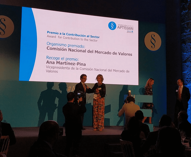 La CNMV ha sido galardonada en la XII Edición Premios Aptíssimi organizados por ESADE Alumni por su contribución al sector de la abogacía. El pasado 3 de octubre, la vicepresidenta de la CNMV Ana Martínez-Pina recogió el galardón en un acto celebrado en el Museo Marítimo de Barcelona. En su discurso recalcó el papel destacado del organismo supervisor en la elaboración de normas nacionales y europeas y en su correcta implementación a través de las diversas labores de supervisión: