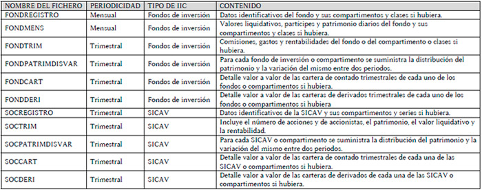 Los ficheros incluirán mensualmente datos básicos de cada fondo de inversión (valores liquidativos, patrimonio y participes). Trimestralmente además incluirán información mucho más detallada sobre diferentes aspectos no sólo de fondos de inversión sino además de SICAV: comisiones, rentabilidades, composición de la cartera, etc. Los ficheros se descargarán en formato XML, con sus esquemas y sus documentos explicativos.