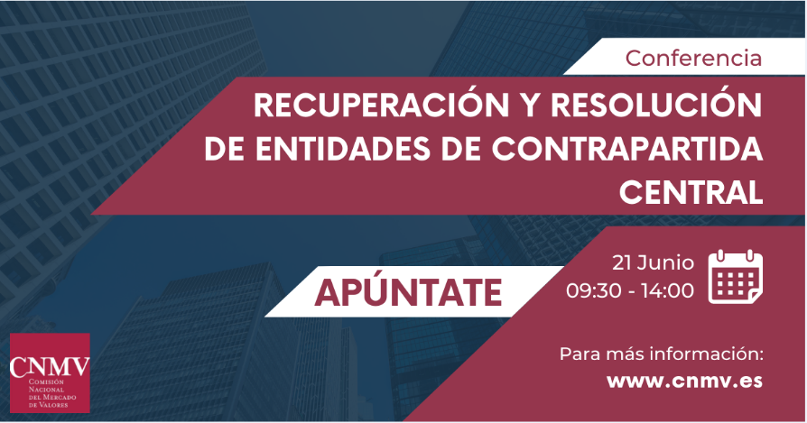 tendrá lugar en Madrid, en el auditorio de CECABANK, la Conferencia sobre recuperación y resolución de entidades de contrapartida central, en la que se abordarán tanto la nueva normativa como sus implicaciones y los retos de futuro. En el evento participarán responsables de la materia en organismos nacionales e internacionales como ESMA, IOSCO y FSB además de relevantes profesionales especialistas en la materia.