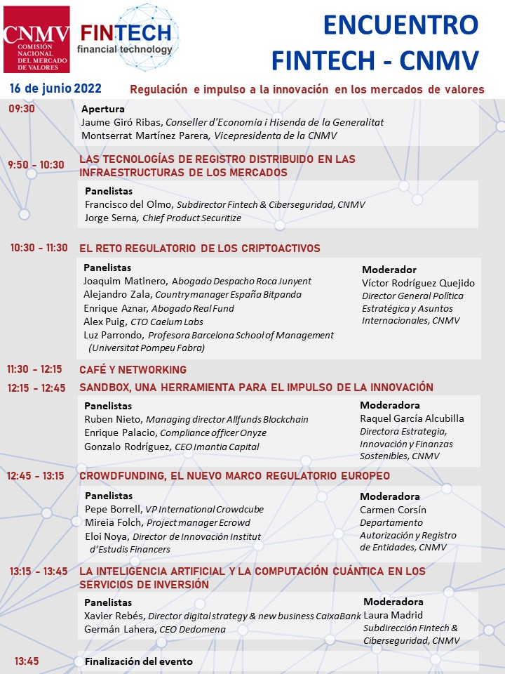 El jueves día 16 de junio tendrá lugar en su sede de Barcelona el Encuentro Fintech CNMV, para abordar la regulación e impulso a la innovación en los mercados de valores. Se abordarán las tecnologías de registro distribuido en las infraestructuras de los mercados, el reto regulatorio de los criptoactivos y temas como el sandbox, el crowdfunding, la inteligencia artificial y la computación cuántica en los servicios de inversión, entre otros. Además de numerosos expertos en el sector, asistirán el conseller Conseller d’Economia i Hisenda de la Generalitat de Catalunya, Jaume Giró Ribas, y la vicepresidenta de la CNMV, Montserrat Martínez Parera.