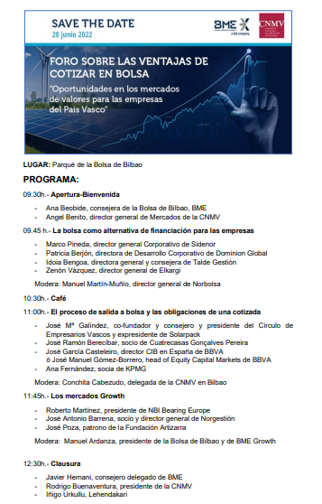 En él se analizará la bolsa como alternativa de financiación para las empresas, se expondrá el proceso de salida a bolsa y las obligaciones de una cotizada así como los mercados Growth.  Además de relevantes personalidades y actores implicados en la materia , el foro contará con la participación del Lehendakari, Iñigo Urkullu, y del presidente de la CNMV, Rodrigo Buenaventura.